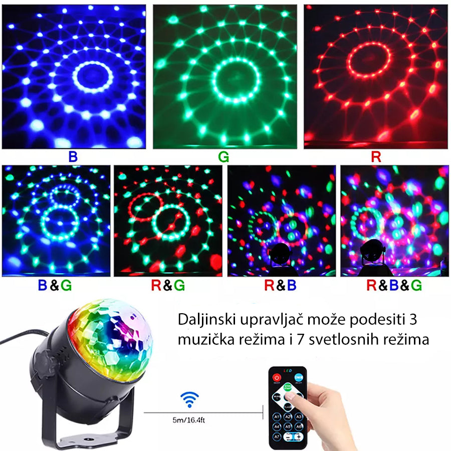 3 režima glasovne kontrole + 7 režima osvetljenja + kontrola obrtaja BRIGHT 7 režima Promena disko svetla: Lako je izabrati jednobojno ili višebojno svetlo za disko kuglu pomoću pogodnog daljinskog upravljača. (crvena, zelena, plava, crvena/zelena, crvena/plava, zelena/plava ili sve zajedno).